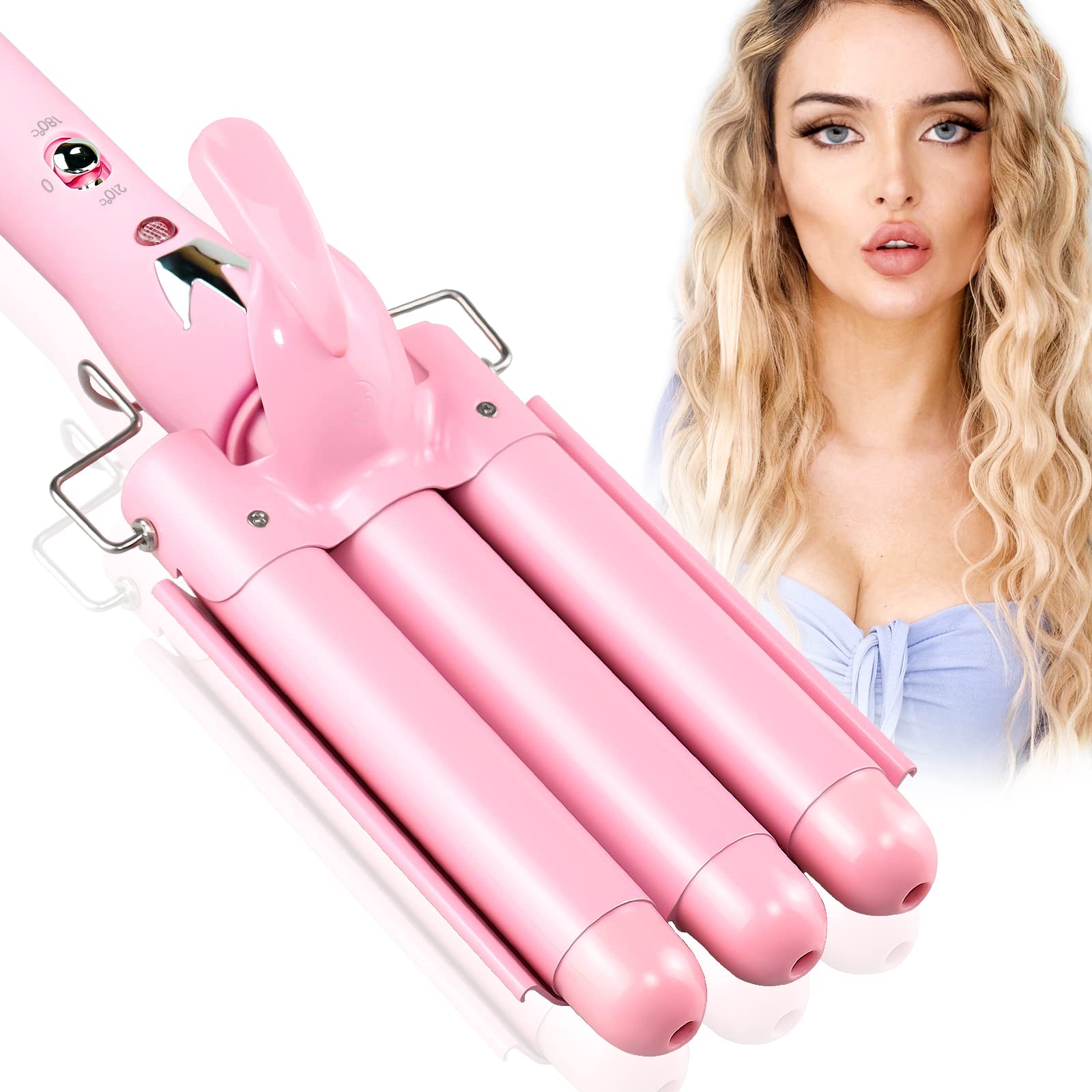 3 Barrel Curling Iron Wand Dual Voltage Hair Crimper - Triple Barrel Hair Waver Temperature Adjustable, Heats Up Quickly (1 Inch, Light Pink)