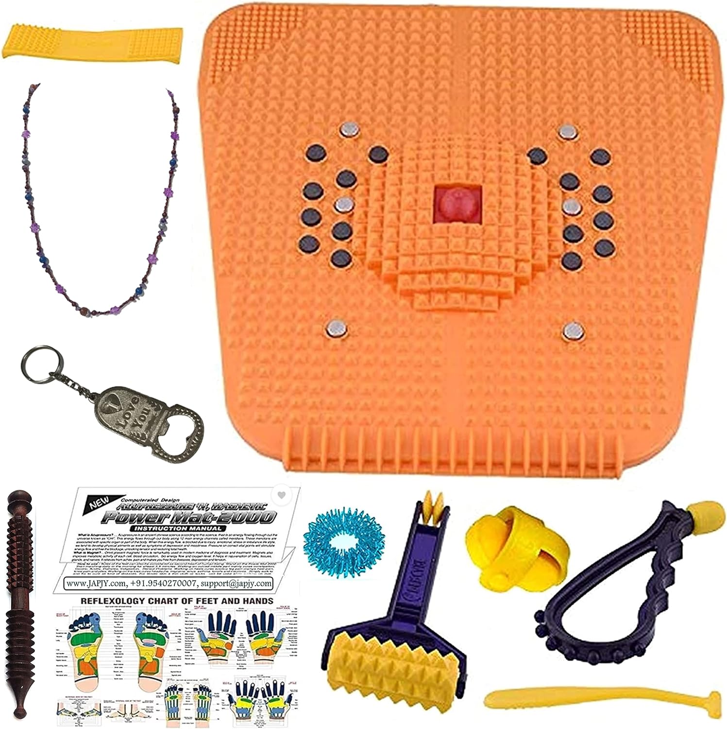 No side effects and is easy to use. One size fits all, making it suitable for everyone in the family to benefit from. Ideal for housewives, office executives, the elderly, students, musicians, and sports persons. The therapy consists of bio magnets, energy ball, and micro point’s charger. The acupressure mat helps stimulate blood circulation and oxygen flow throughout the body The power energy roller-sharp, rolled in the palm, hand, leg, neck for 2 minutes daily for total health care.