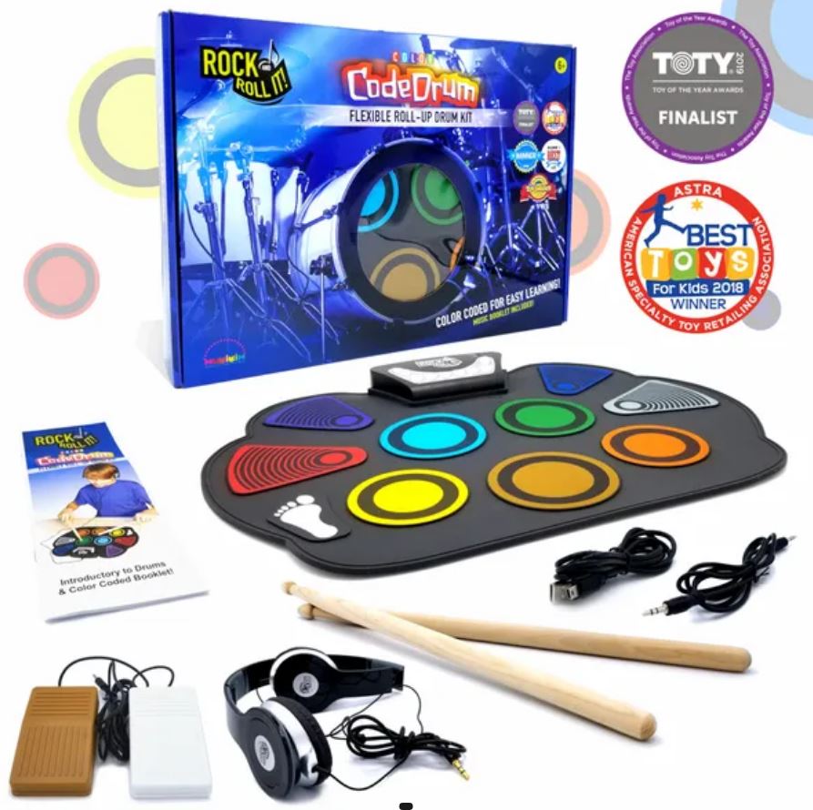 - LEARN TO PLAY THE DRUMS: Perfect for beginners- rock out then roll it up! Color coded set using a spectrum of color makes it easy to learn with included Music Book.