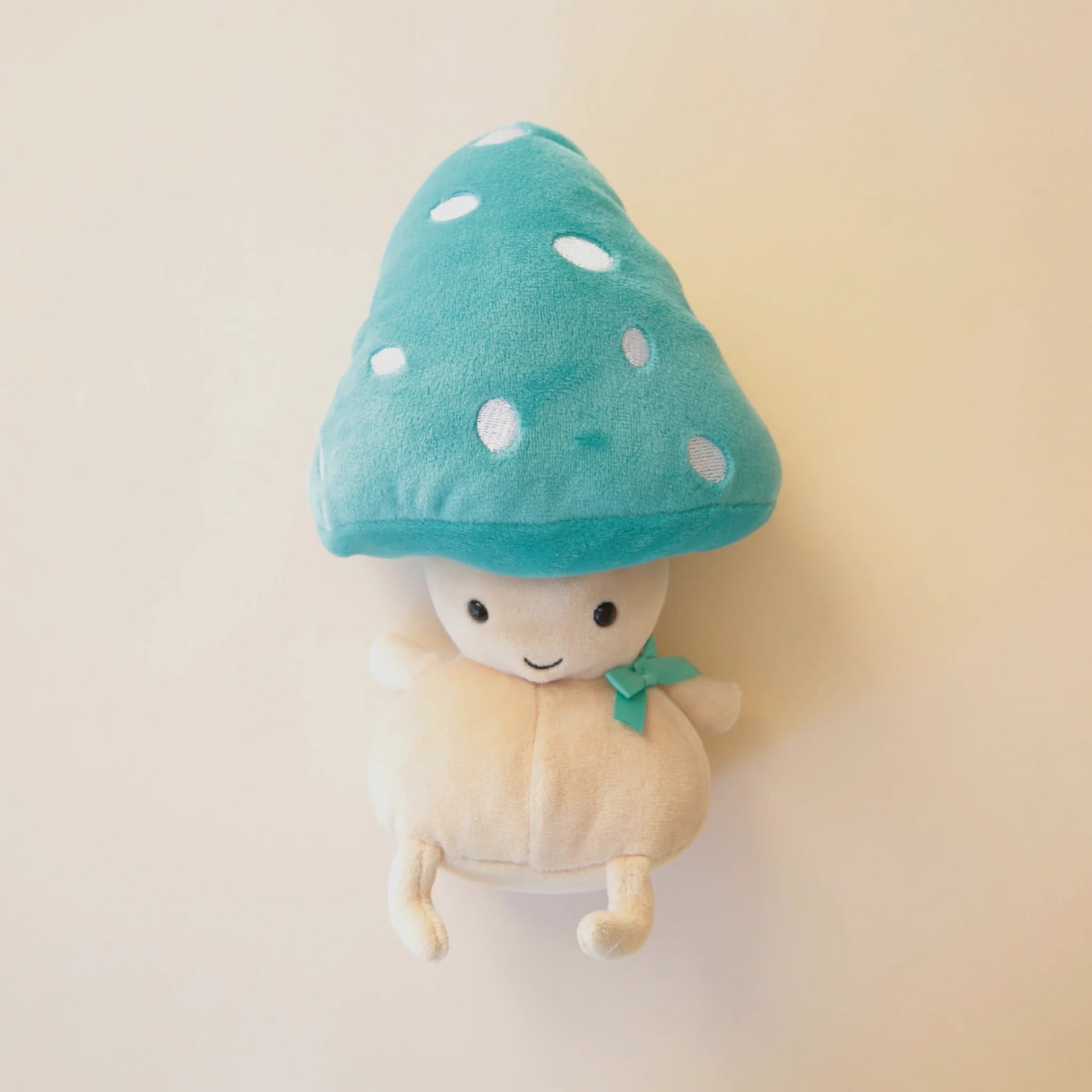 Fun Guy Bertie is round like a tiny pumpkin! This cheery friend wears a squishy statement mushroom cap with bold turquoise tones and white spots.