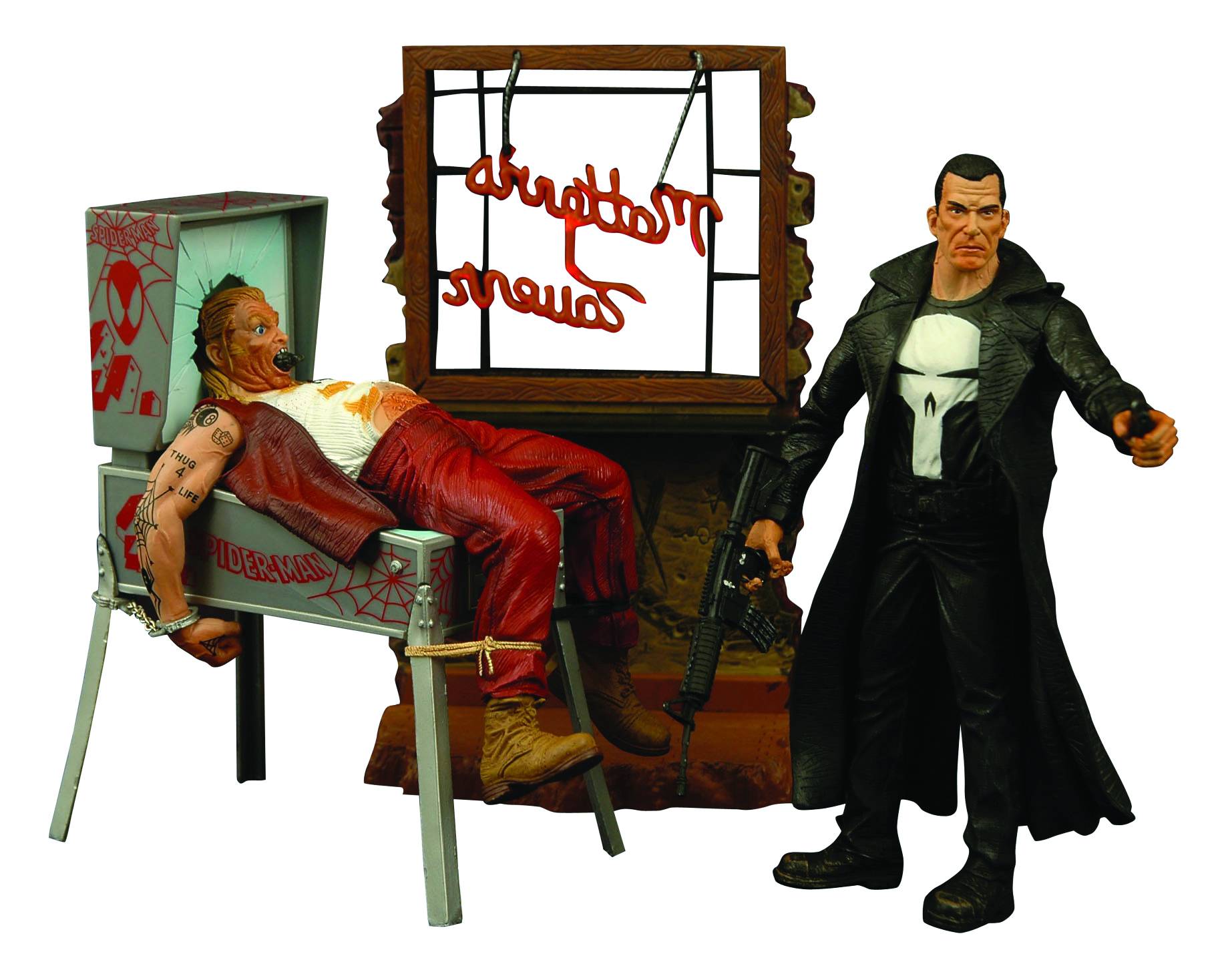 A Diamond Select Release! Inspired by the historic Punisher run by writer Garth Ennis with striking covers by Tim Bradstreet, sculptor Steve Kiwus has captured every detail of Tim's art and the violence of Garth's stories. This figure comes complete with Spider-Man pinball machine, bar wall, and tortured informant.